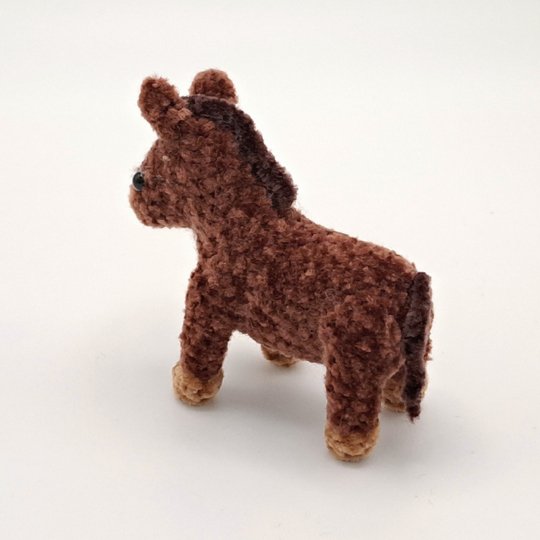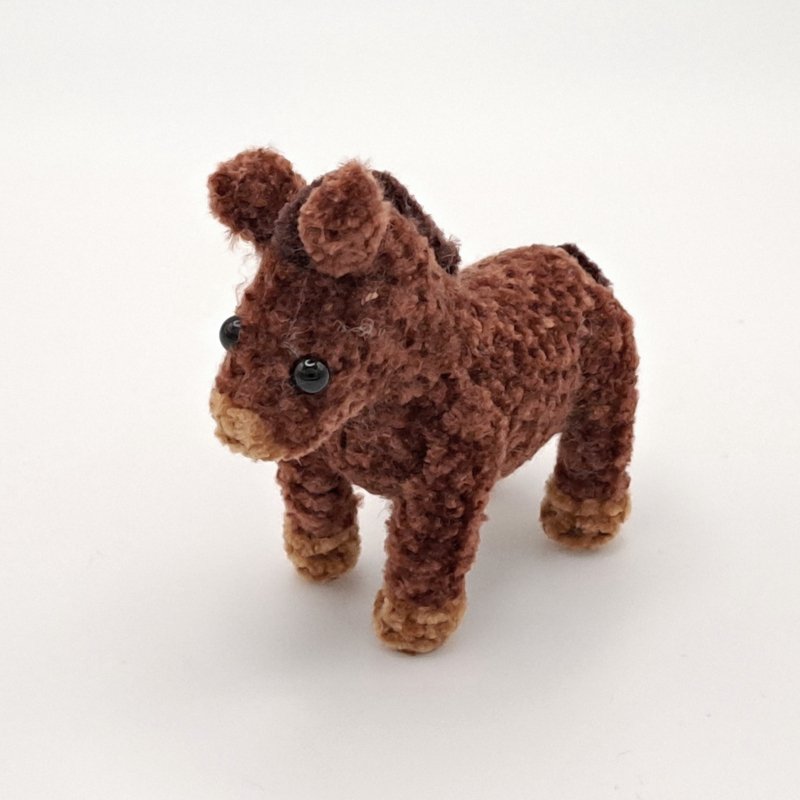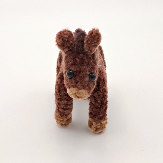 Using a 2,0mm-crochet hook and a 2,0mm-velvet-yarn, the animal will be about 7,5 cm long and 7,5 cm tall.