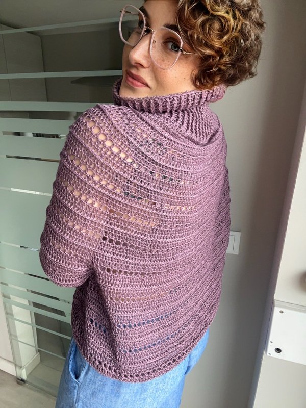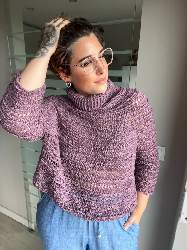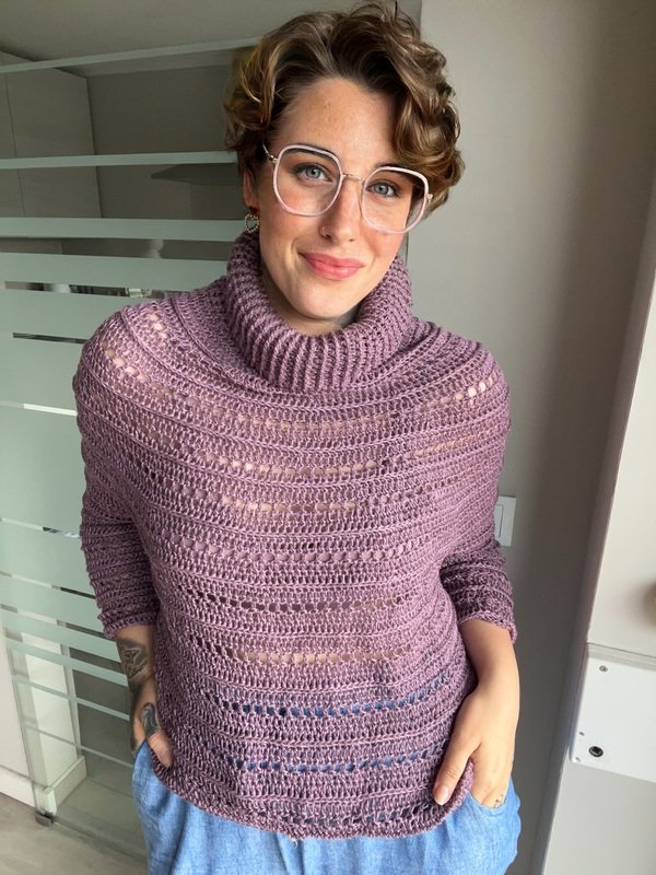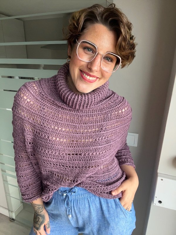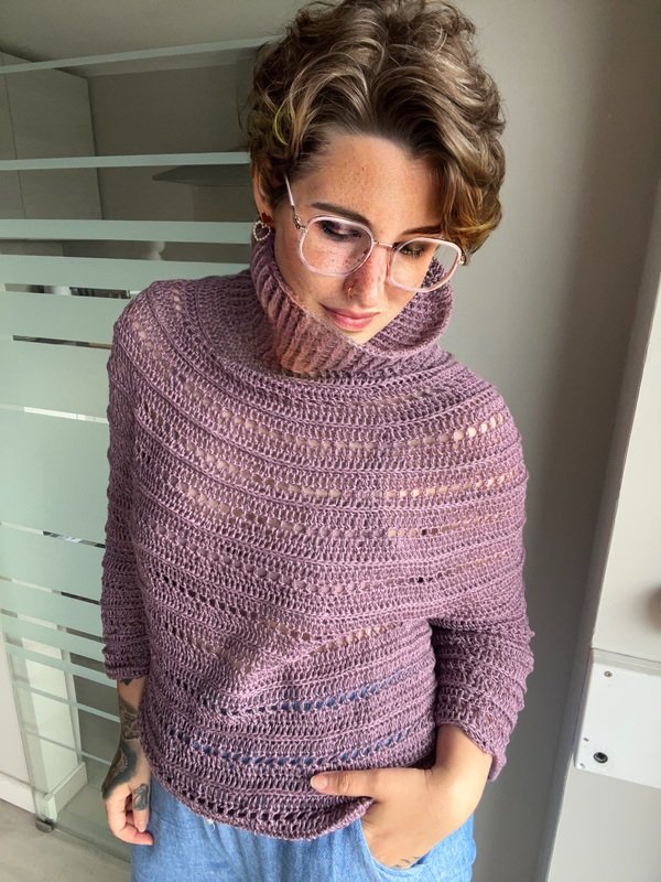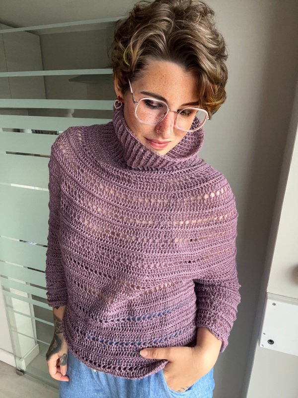 Klar, modern und mit einem Hauch Extravaganz – „Stella“ ist der perfekte Begleiter für alle, die handgemachte Mode lieben. Der strukturreiche Rollkragenpullover wird nahtlos von oben nach unten gehäkelt und überzeugt durch seine klaren Linien, interessante Muster und eine angenehm körpernahe Passform.