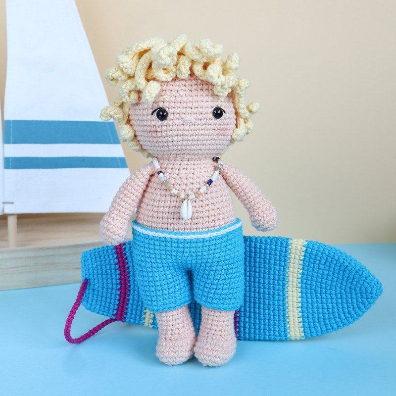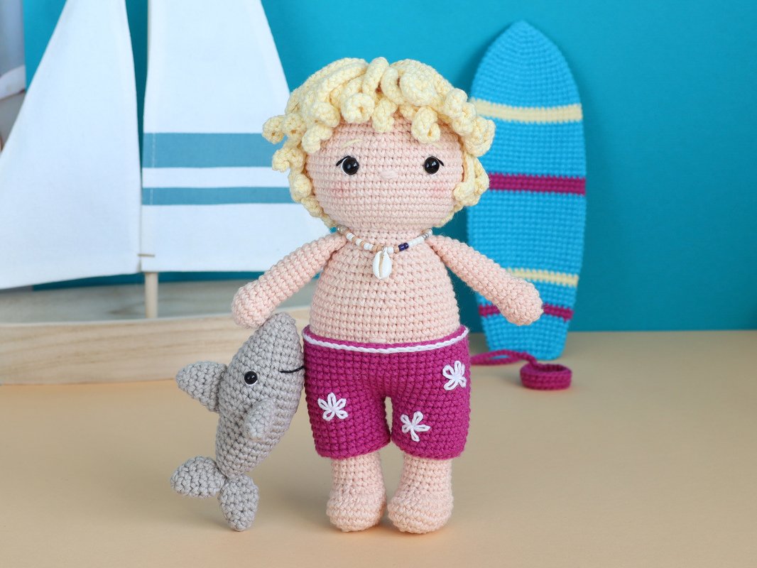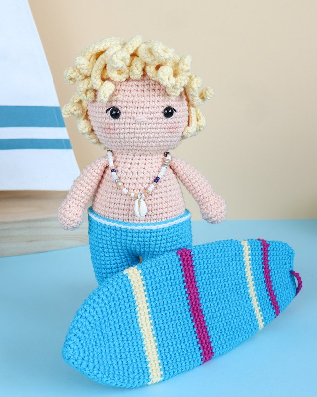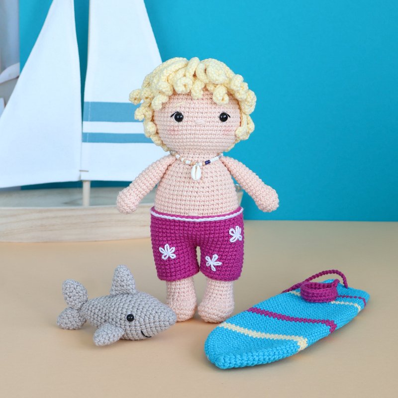 This is a digital crochet pattern for the Surfer Sven, the surfboard and the little shark.