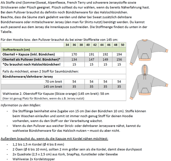 Basic knowledge of sewing stretchy fabrics like jersey or sweat is recommended.