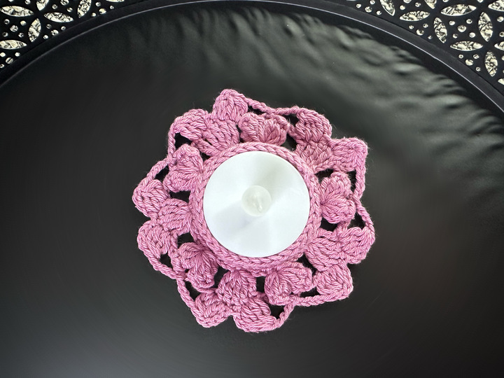 The finished crocheted LED Tealight Holder measures approximately 10 cm (3.94 in) in diameter and 2.5 cm (0.98 in) in height.