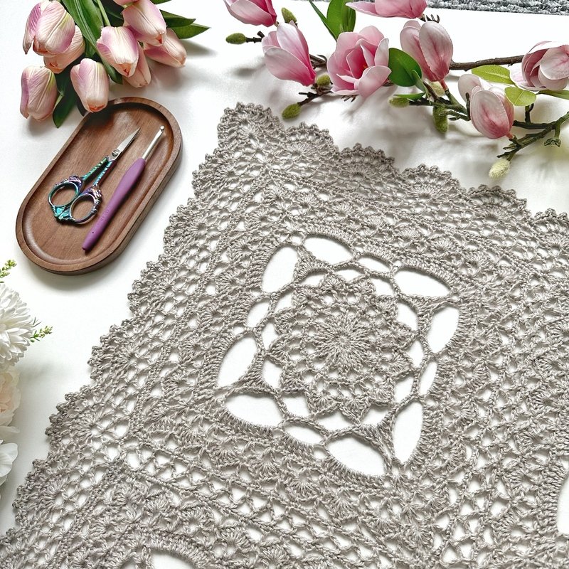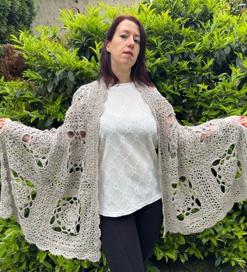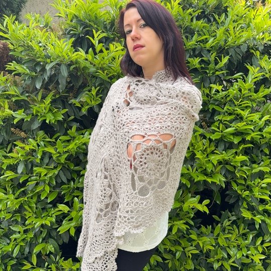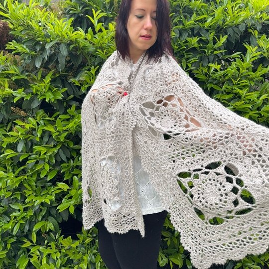 Wrap yourself in elegance with this stunning lacy crochet shawl, crafted from 12 delicate squares.