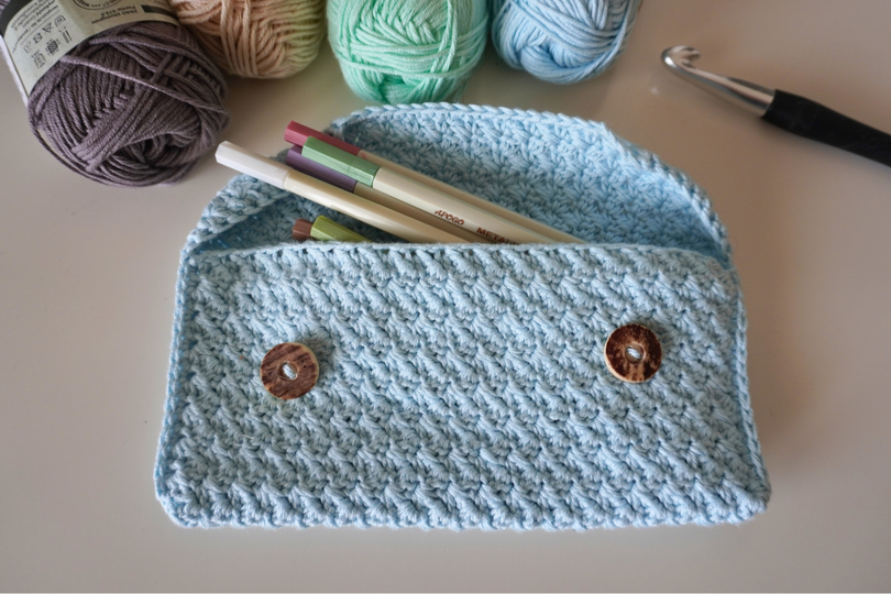 With this pattern, you’ll crochet a simple yet highly practical and versatile pouch – perfect as a pencil case, makeup bag, gift wrap, or to store small items.