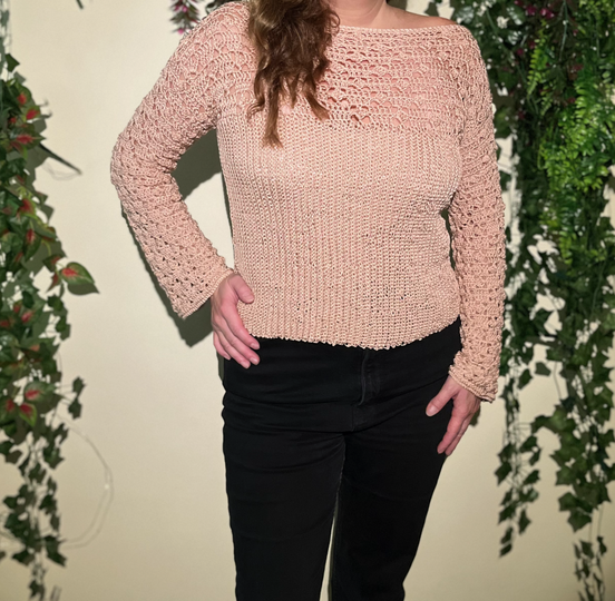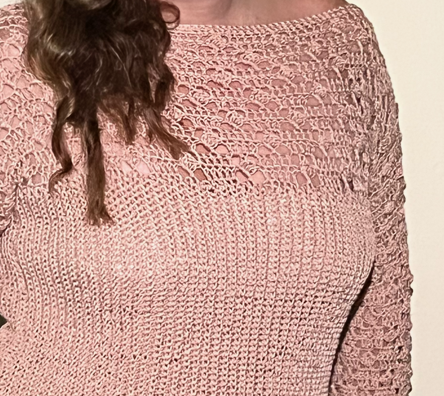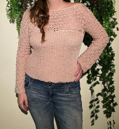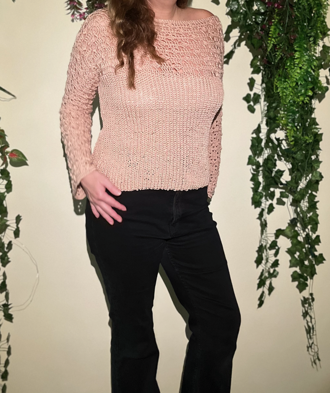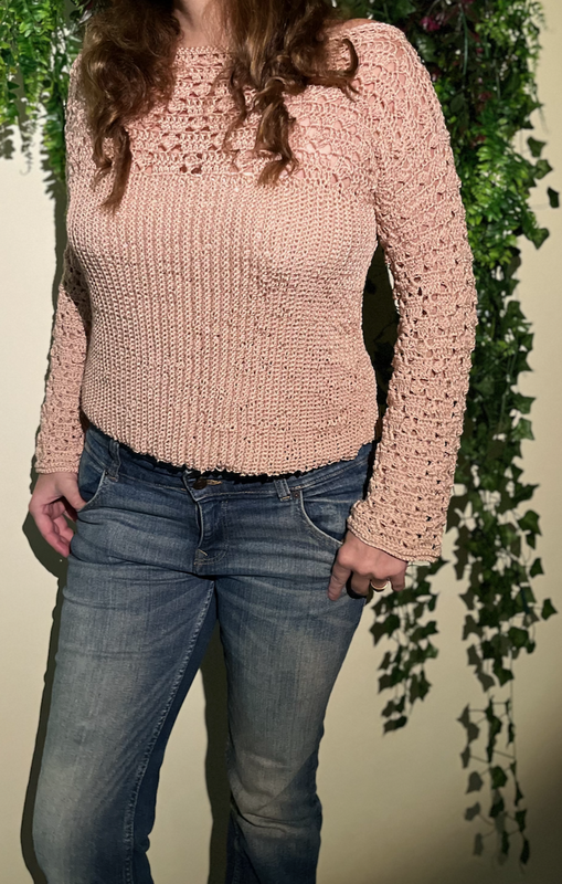The elegant boat neck gently accentuates the shoulders and gives the shirt a feminine touch. The heart of the design is the intriguing combination of two different crochet patterns: The body of the top is worked in a fine, vertically ribbed pattern, ensuring a flattering fit and offering a beautiful texture.
