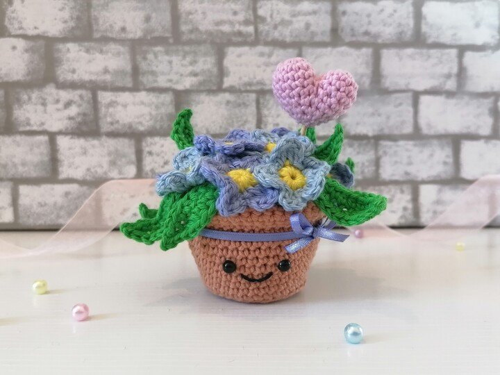 This pattern does not teach the basics of crochet. This crochet pattern consists only of written instructions and how-to photos that explain how to crochet amigurumi bouquet of forget-me-nots with heart.