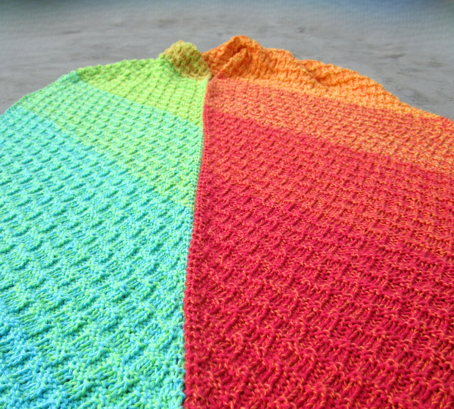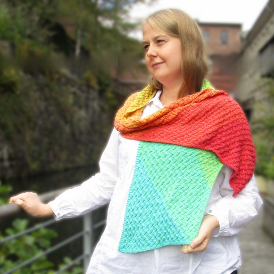 The scarf will be a real eye catcher, whether you choose to use a gradient yarn, thus creating diagonal colour stripes and texture or a solid colour with just diagonal texture.