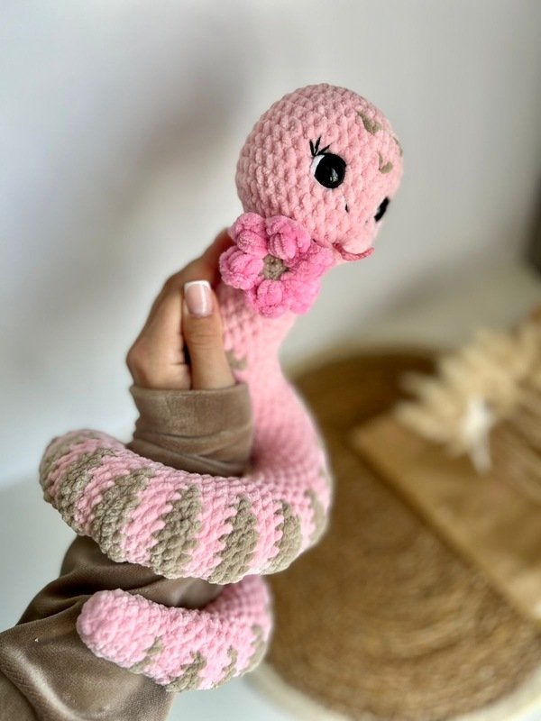 When using indicated materials and tools, the length of the snake will be approx. 95-100 cm. It depends on your tension of crocheting.