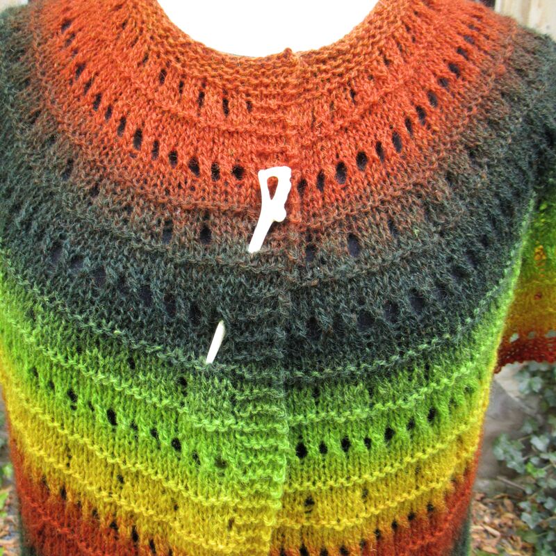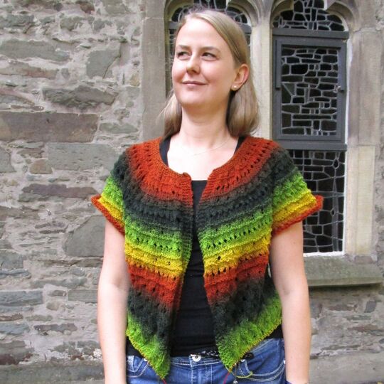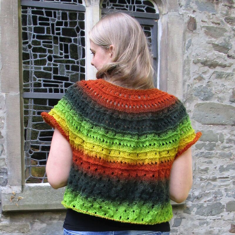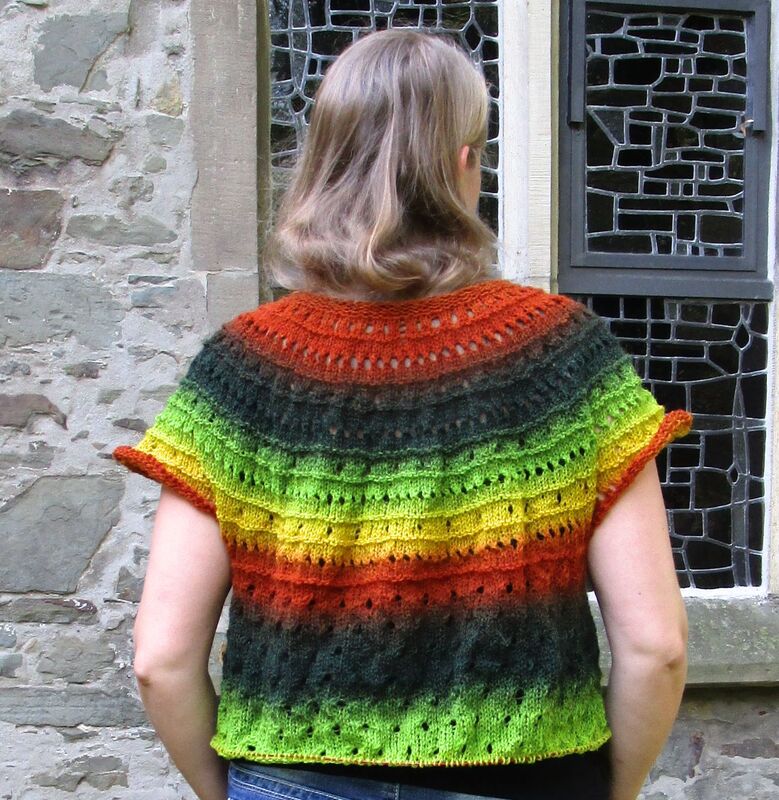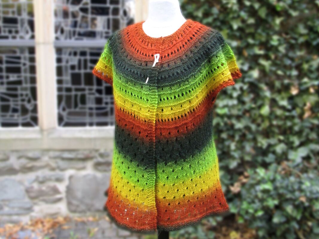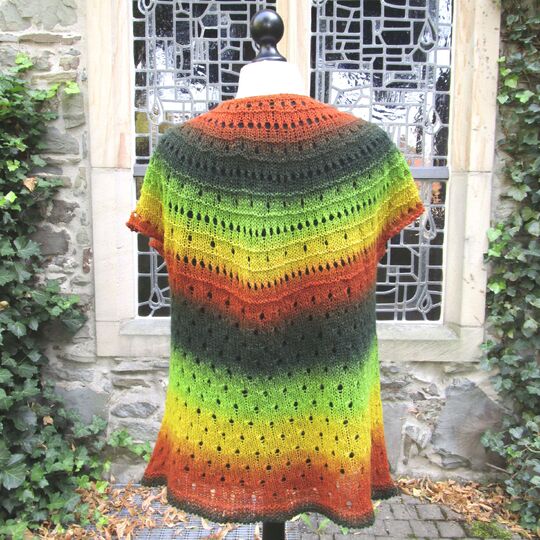Crepidula is very appropriate for variegated yarns, because you can knit top-down with one single thread without breaking. You knit as long as there is wool left or you reach the desired length. You can also knit the lower egde with some matching yarn.