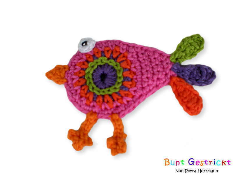 The bird is crocheted using chain stitches, single crochet stitches, double crochet stitches, and slip stitches.
