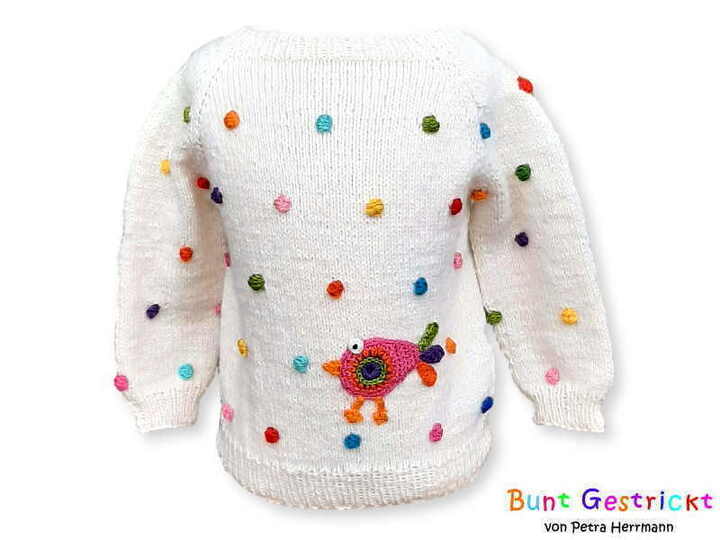 The sweater is knitted as an RVO, and the bubbles and the little colorful bird are crocheted.