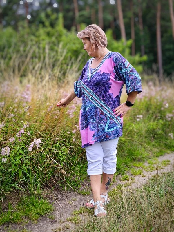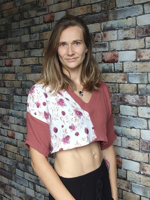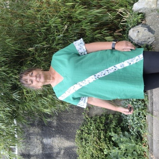 Varda is a versatile sewing pattern for a unique patchwork top with creative design options. You can choose between different panel styles – asymmetrical, symmetrical, or none at all – as well as two variations of a V-neck: a classic faced version or an overlapping one.