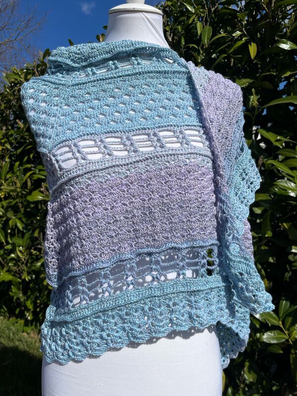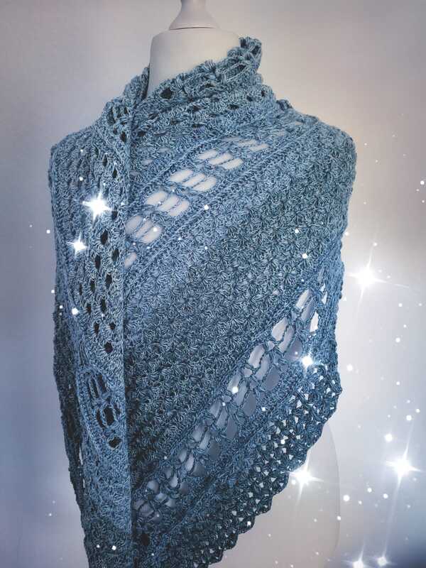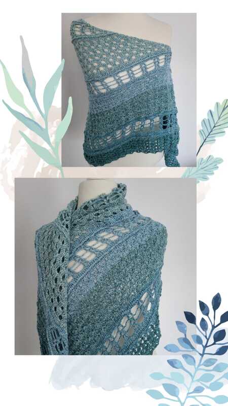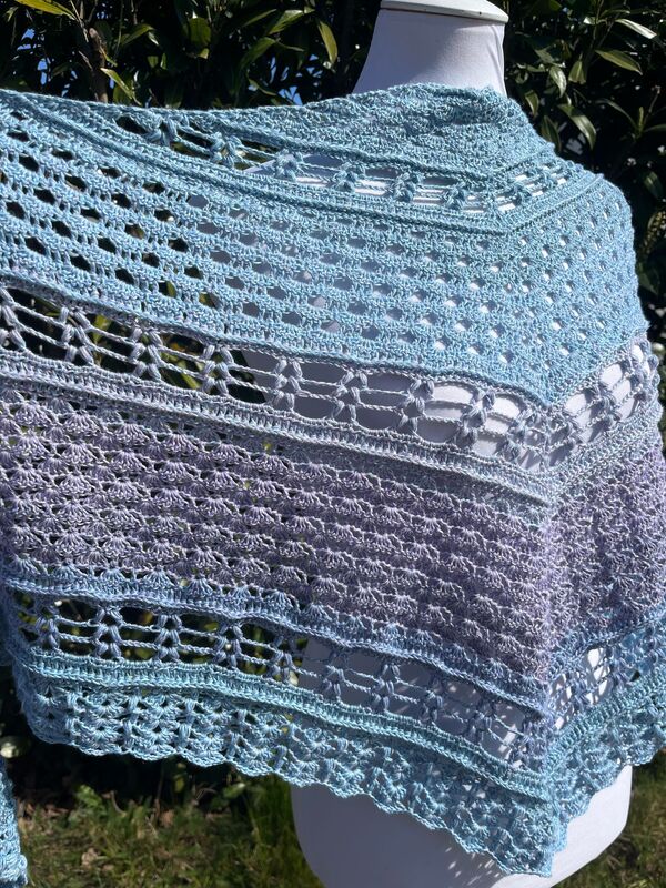 Das Tuch auf dem Foto wurde mit dem Bobbel „Steife Briese“ von Wollfamos/Yarnbox gehäkelt.