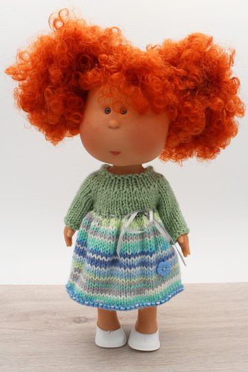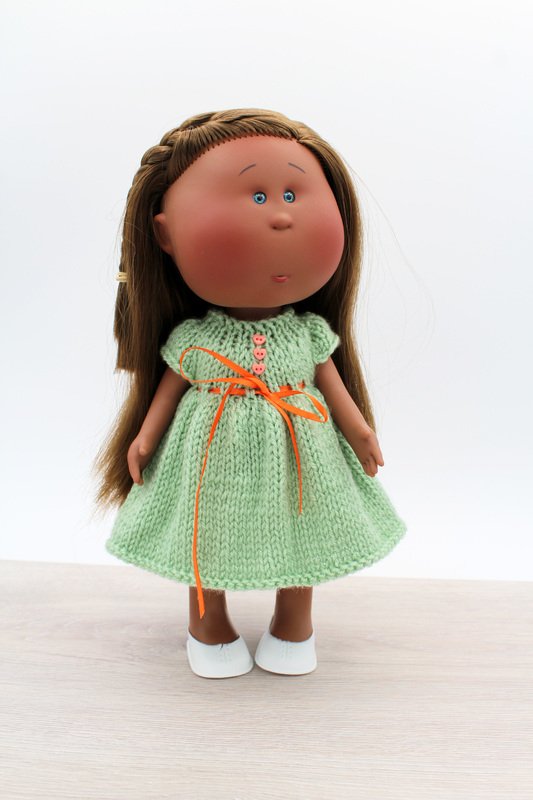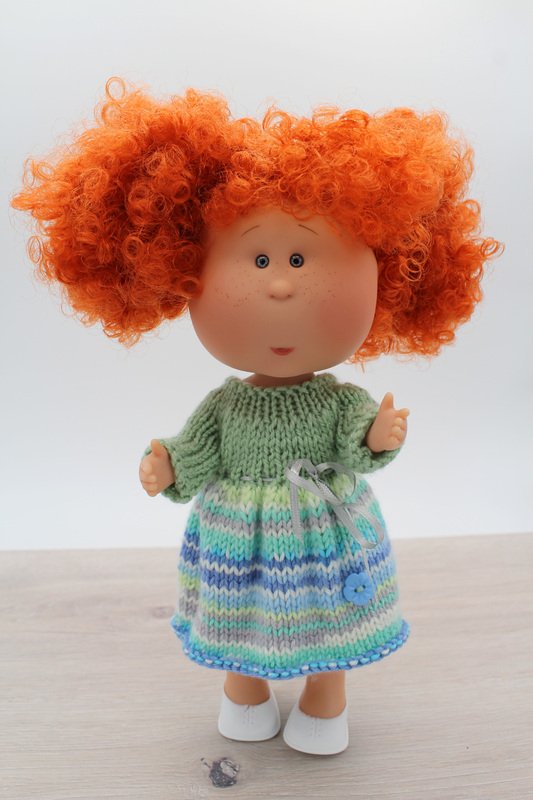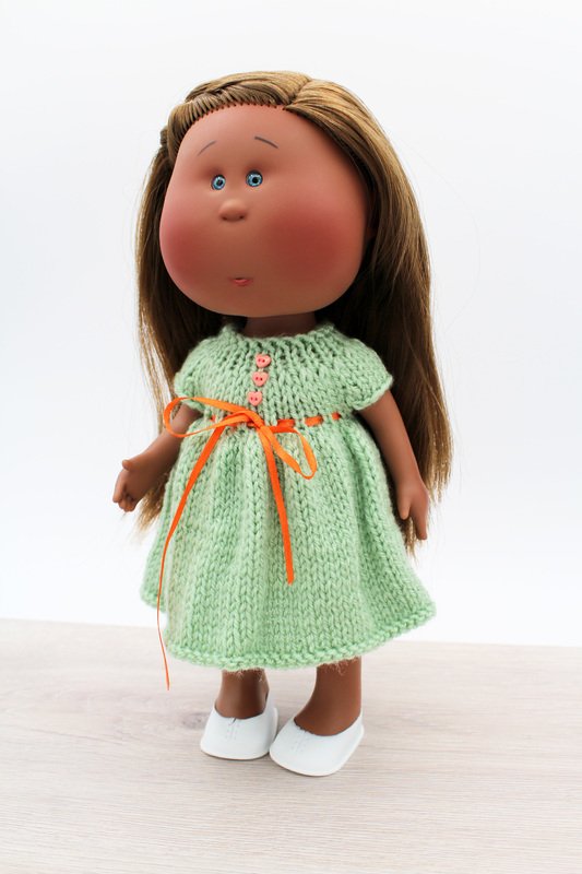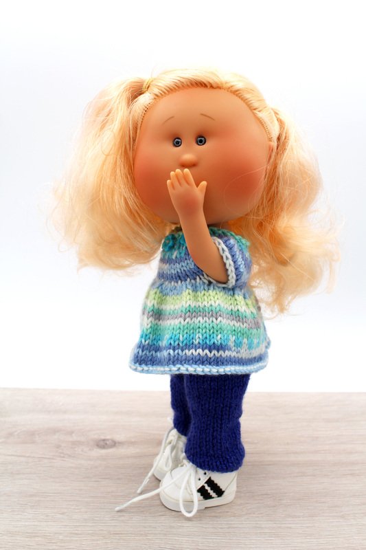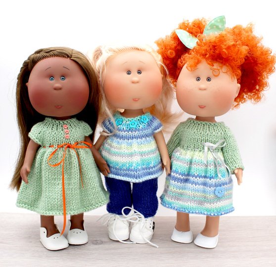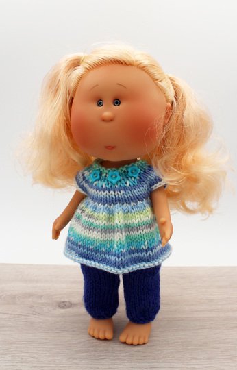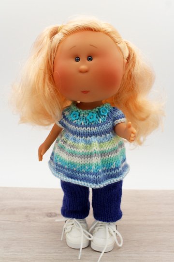 This knitting pattern includes 8 pages of row by row instruction for knitting two cute dresses, top and pants for cute doll (12"/30cm).
