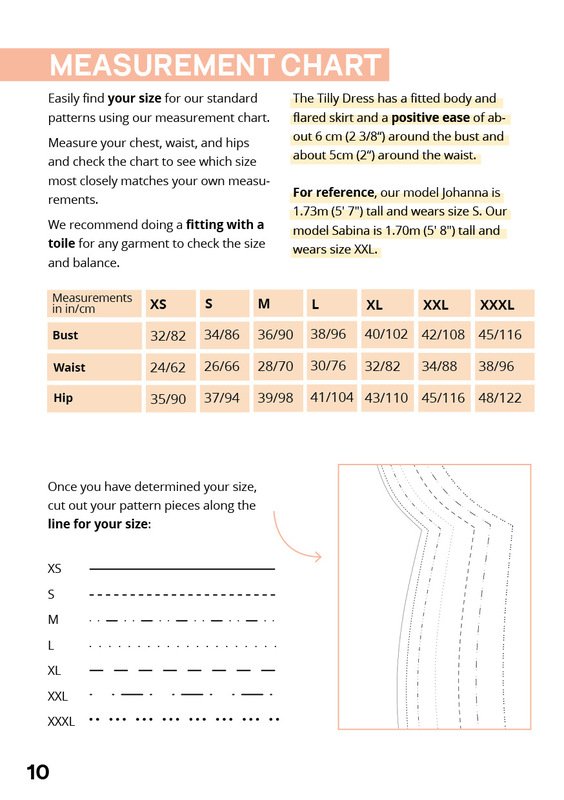 out 6 cm (2 3/8“) around the bust and about 5cm (2“) around the waist. For reference, our model Johanna is 1.73m (5′ 7″) tall and wears size S. Our model Sabina is 1.70m (5′ 8″) tall and wears size XXL.