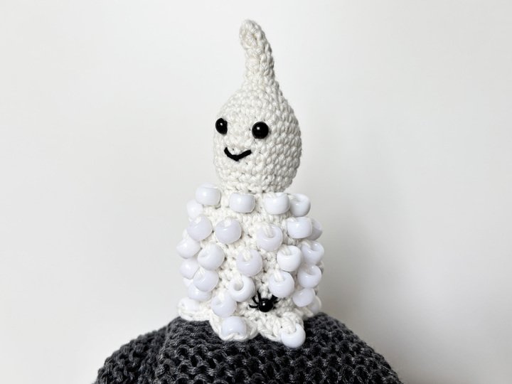 This adorable crocheted ghost amigurumi combines spooky Halloween charm with playful cuteness. With delicate bead details, a mini spider, and a soft, squishy shape, it’s great for squeezing, fidgeting, or simply adding a touch of charm to your fall and Halloween décor.