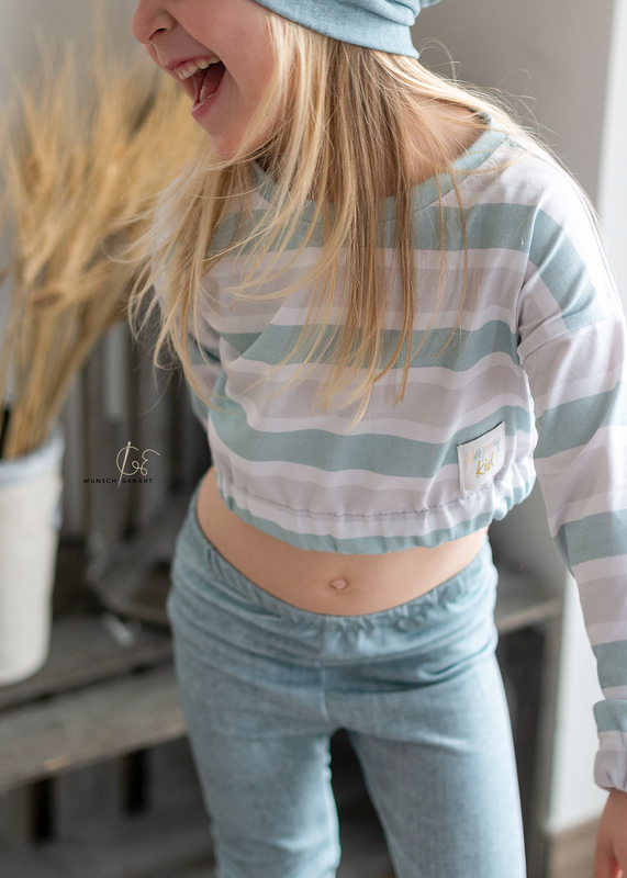 Die langen Ärmel werden nicht normal gesäumt, sondern können mit einem niedlichen Paperbag - Abschluss genäht werden, mit einem Gummizugsaum oder auch mit einem Bündchen - Abschluss. Für den Sommer bietet sich an die langen Ärmel wegzulassen und das Cropped oder nicht einfach mit kurzen Ärmeln zu nähen.