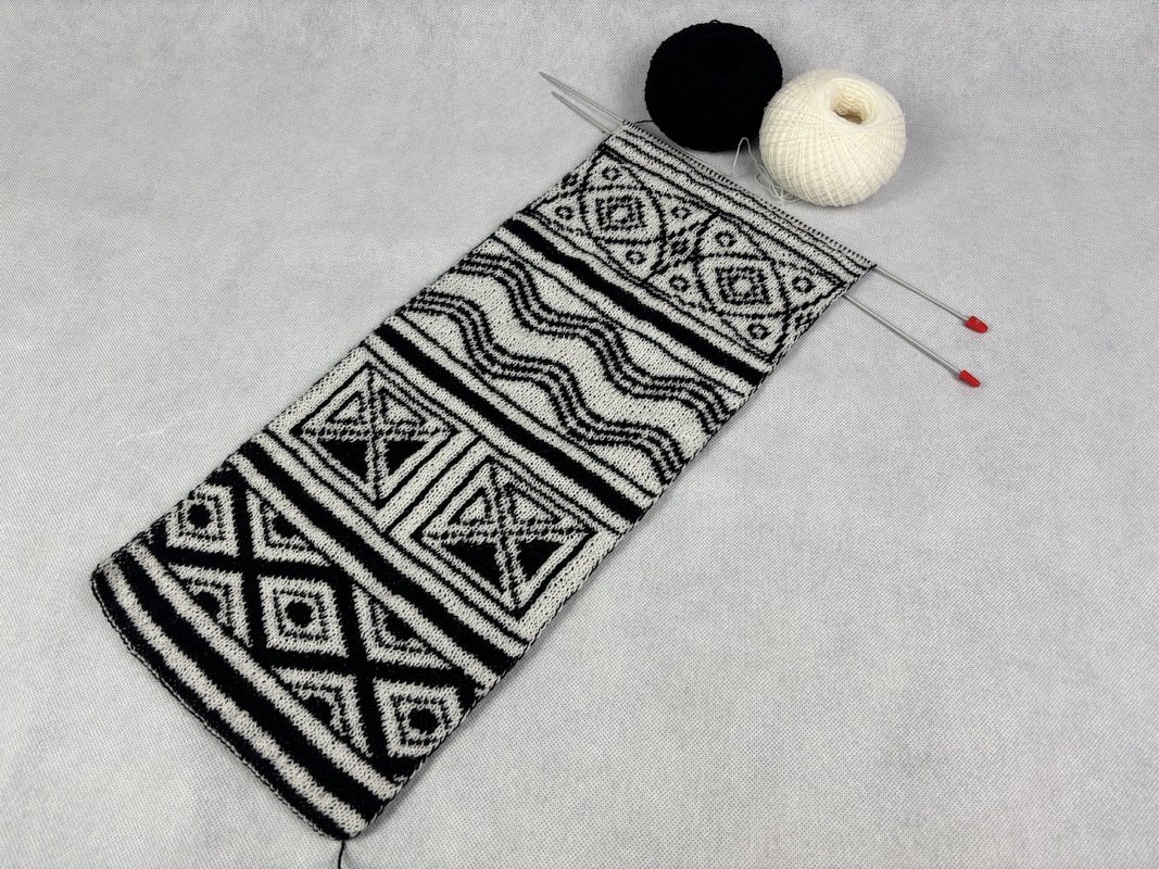 Although many of the panels are easy to master even for relative beginners in the double face technique, some of the panels are rather difficult. In its entirety, I would recommend this scarf only for experienced double knitters. In the instructions, the level of difficulty is indicated at the beginning of the description of each panel. If you don't have that much experience and still want to try this scarf, you can decide to skip the most difficult panels. The options for lengthening the shawl explained in the instructions show how to compensate for the loss of length by omitting one or more panels.
