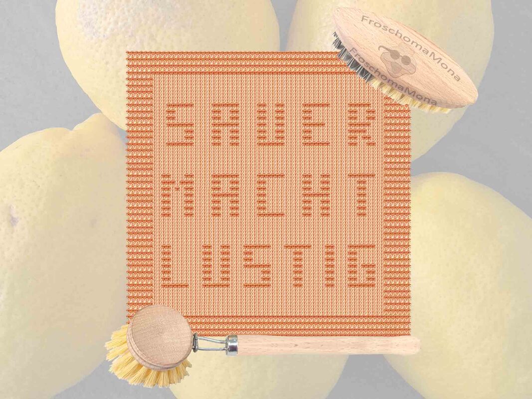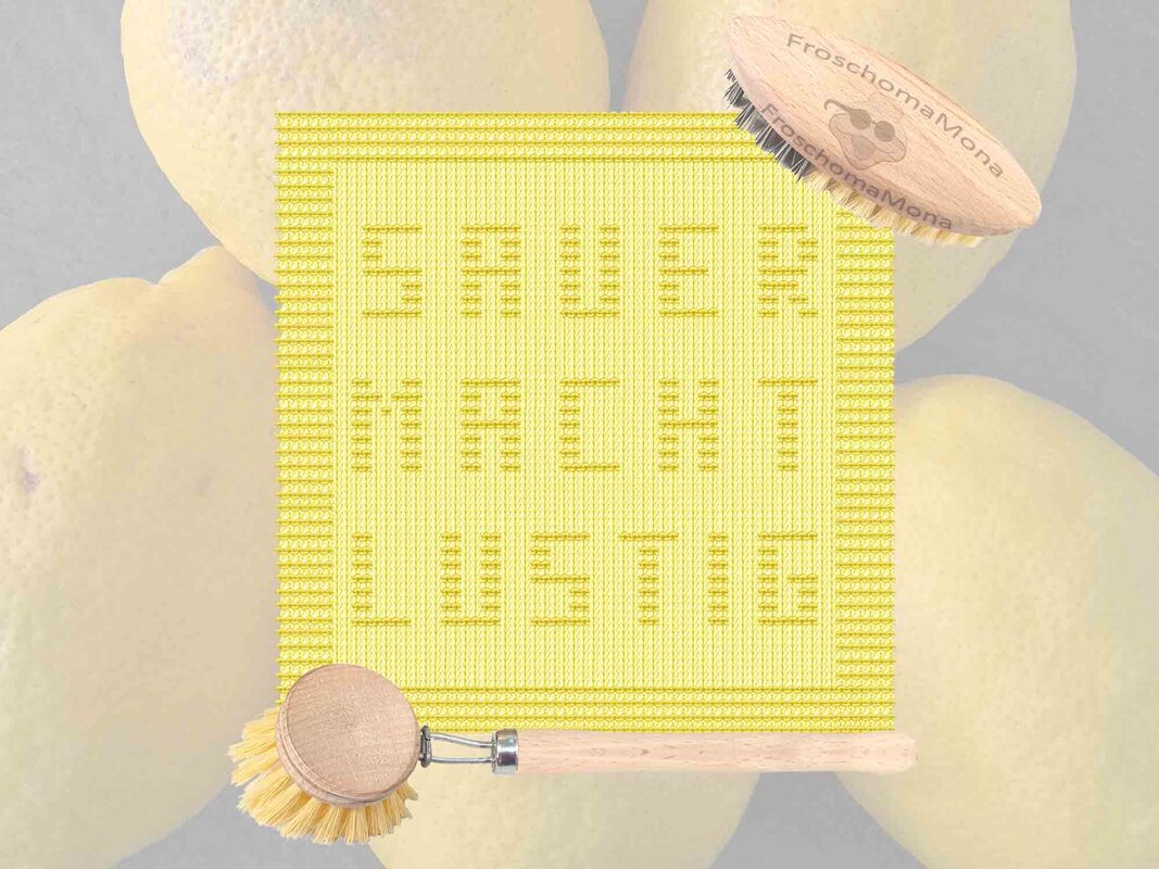 Ein Tuch enthält Bilder von 2 Zitronen und ein Tuch enthält den Spruch „Sauer macht lustig“.