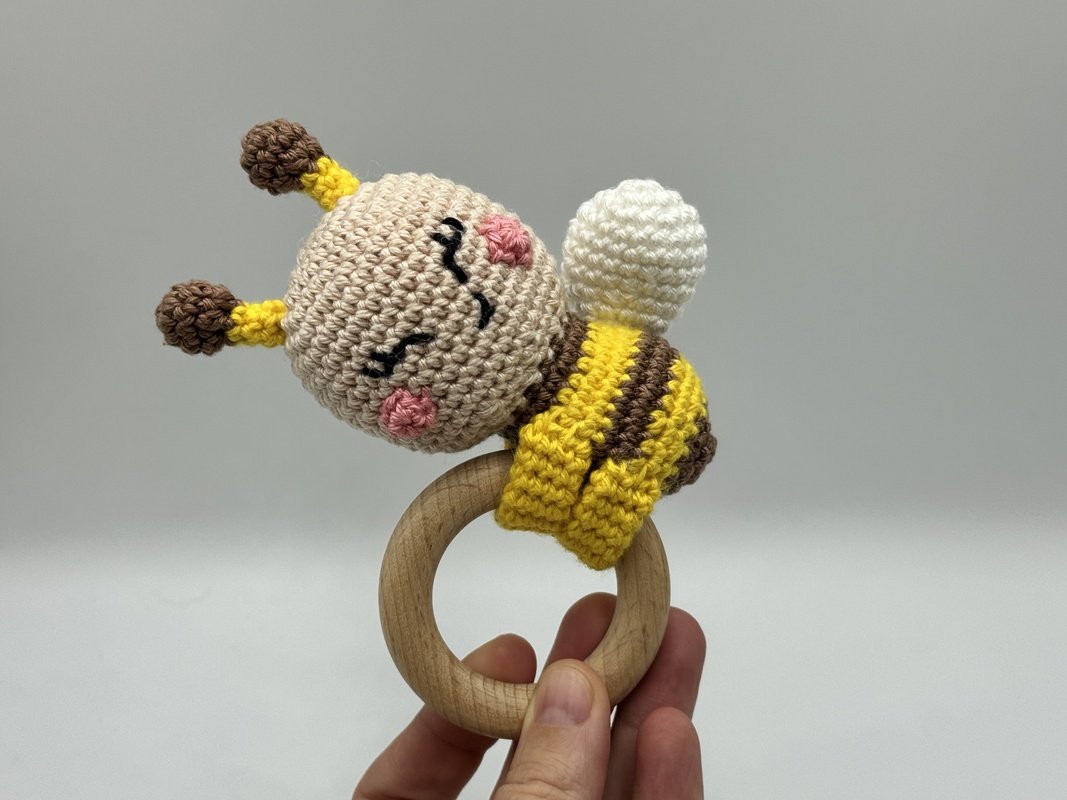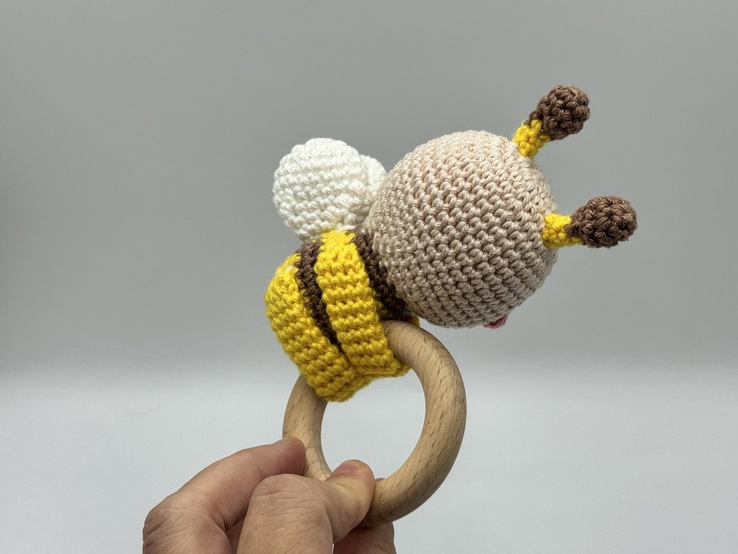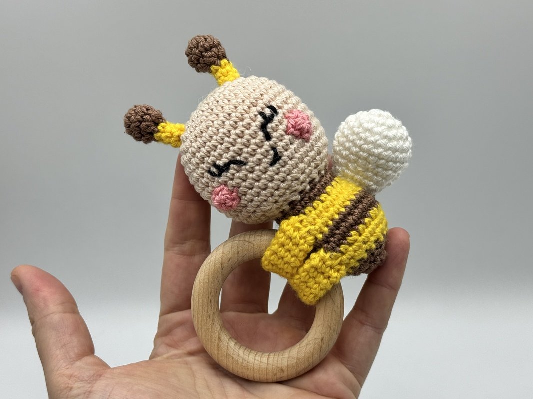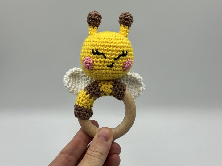 With this crochet pattern, you can create adorable bee-shaped teething rings – the perfect gift for little explorers! The finished teething rings measure approx. 10 cm high and make a lovely handmade present.