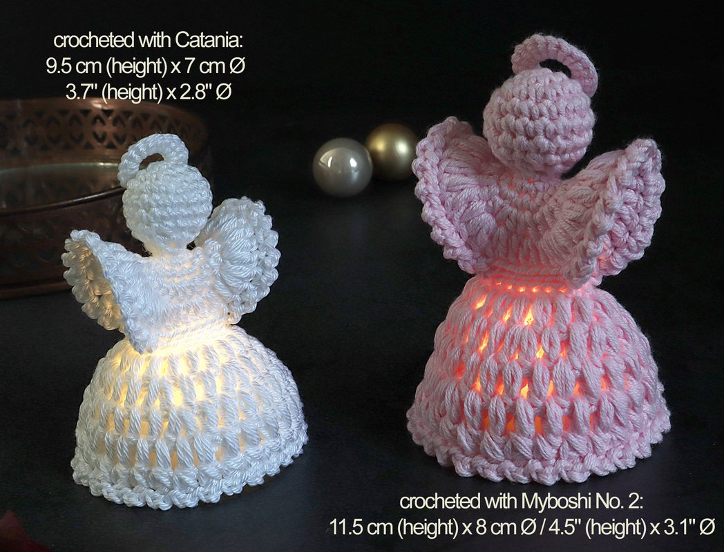 You can crochet the angel in one solid color – in this case you only need to weave in the ending tail – or add elegant accents with glitter yarn. In the two-color variation, there will of course be a few more ends to weave in. Since working with glitter yarn can be a bit more challenging, I recommend this version only for experienced crocheters.