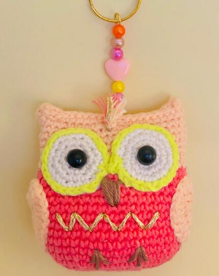 You can make “Goldie” in any color you like – from natural shades to bright, fun tones. The finished owl is a real eye-catcher on bags, Christmas trees, or as a lovely handmade gift.