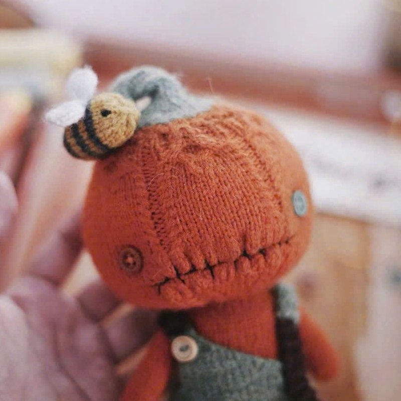 My PDF knitting pattern is written in English and contains 16 pages filled with clear, detailed instructions and over 50 step-by-step photos to guide you through each step. It’s very easy to follow! — from shaping the pumpkin head with its twisted stem, to the cute overalls with straps and buttons, and of course, the little bee that makes this doll so special.