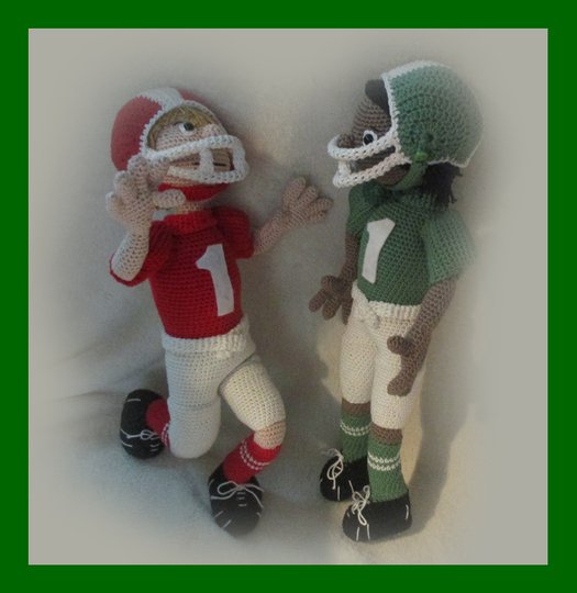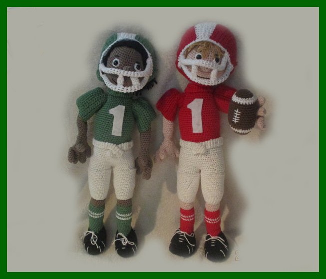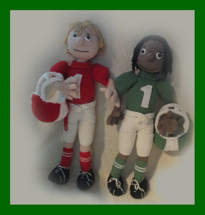 Crocheting cotton : 1 skin color, 1 black, 1 white, some gray, 2 red (or a color of your choice), 1 golden brown (for hair or a color of your choice), 1 brown
