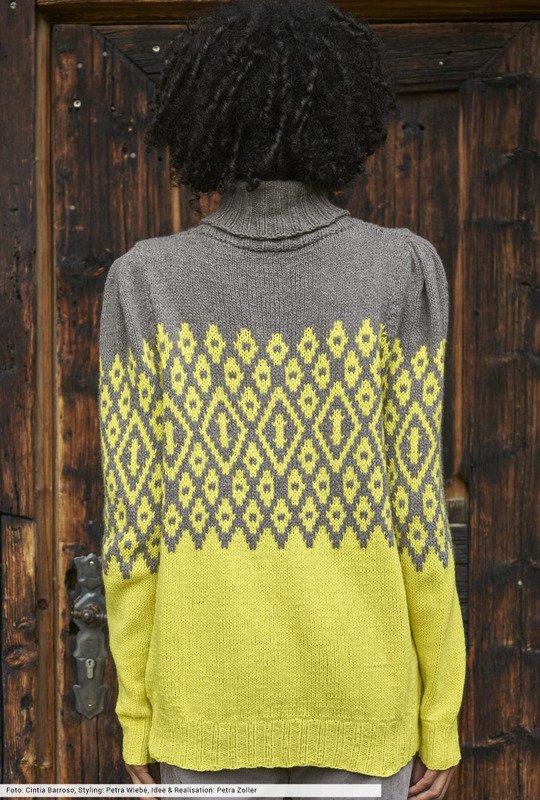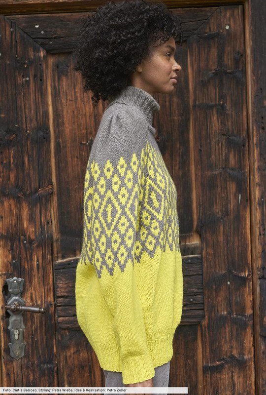 Das geometrische Jacquard-Design im oberen Bereich macht diesen Pulli einzigartig. Du findest dafür in der Anleitung ein übersichtliches Zählmuster, das du einfach glatt rechts verstrickst. Und auch die Farbkombination fällt auf: Mit sonnigem Gelb und holzigem Braun schaffst du dir ein Statement, das Sie nicht nur in einer Saison begleitet. Dafür sorgen auch die im Schulterbereicht angepufften Ärmel, die den modischen Aspekt unterstreichen.