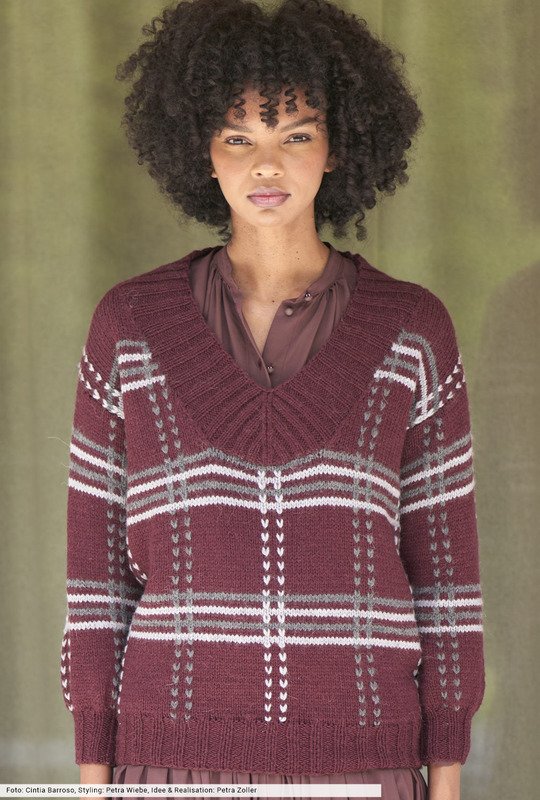 Zuerst drei Farben im Streifendesign glatt rechts stricken, dann die senkrechten Linien im Maschenstich aufsticken – fertig ist ein Muster, dass sich allover in Karo-Optik in Szene setzt. Und an das sich auch weniger versierte Strickerinnen wagen können. Nur bei der Ausarbeitung der breiten Ausschnittlblende muss man ein bisschen aufpassen: Hier wird zur Formgebung in der Mitte abgenommen. Wie das funktioniert, haben wir in unserer Anleitung genau beschrieben.