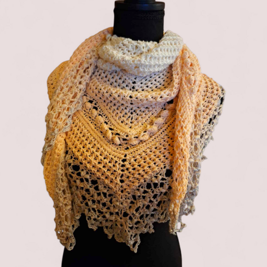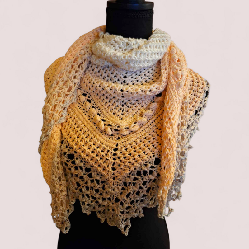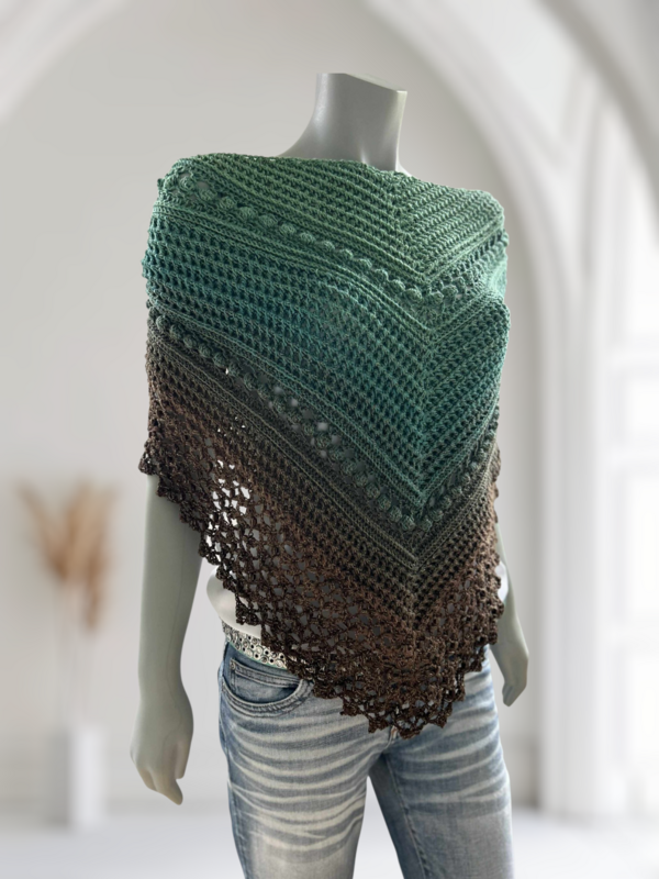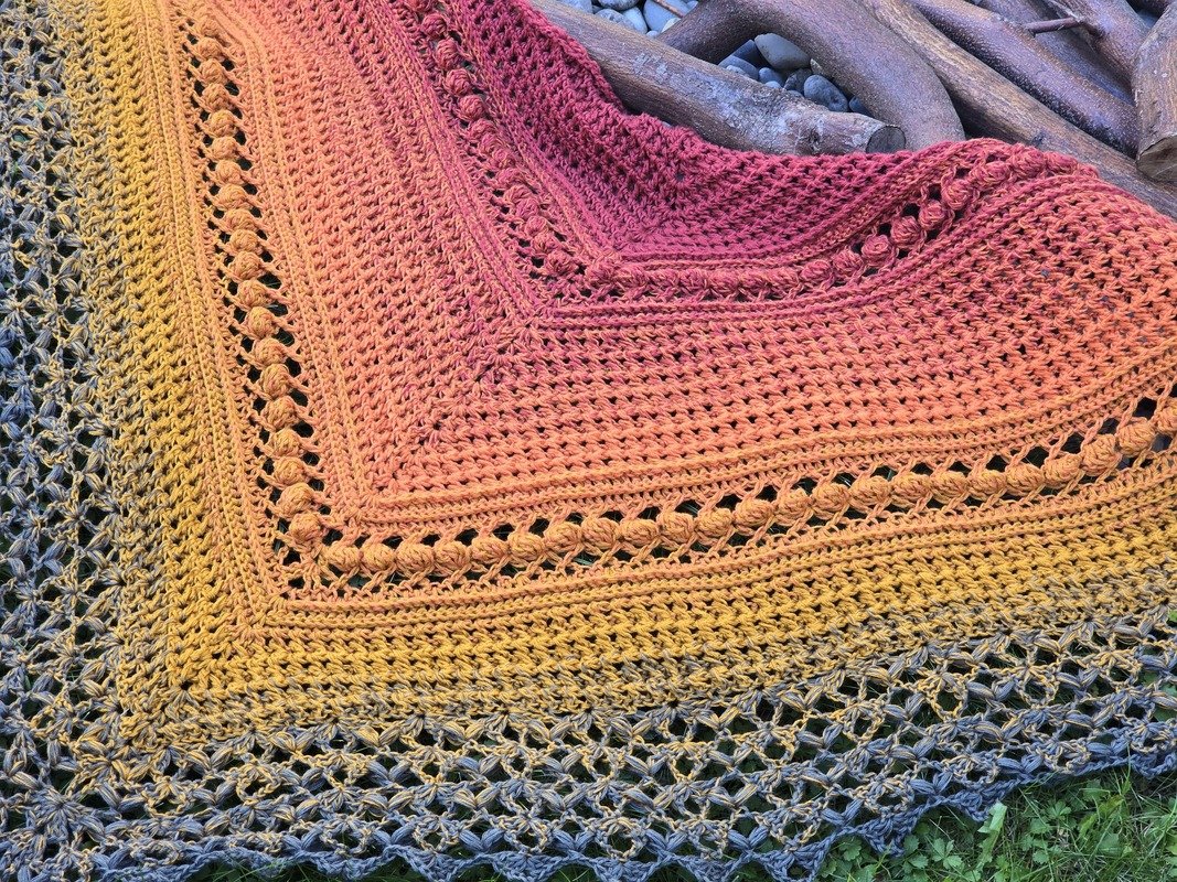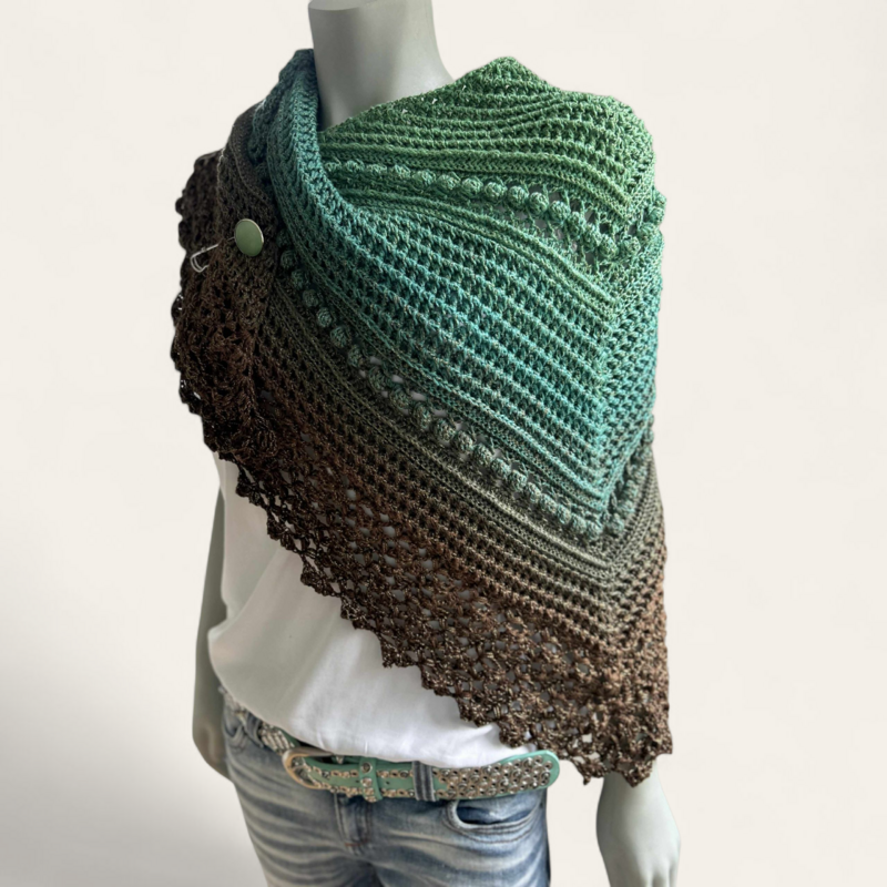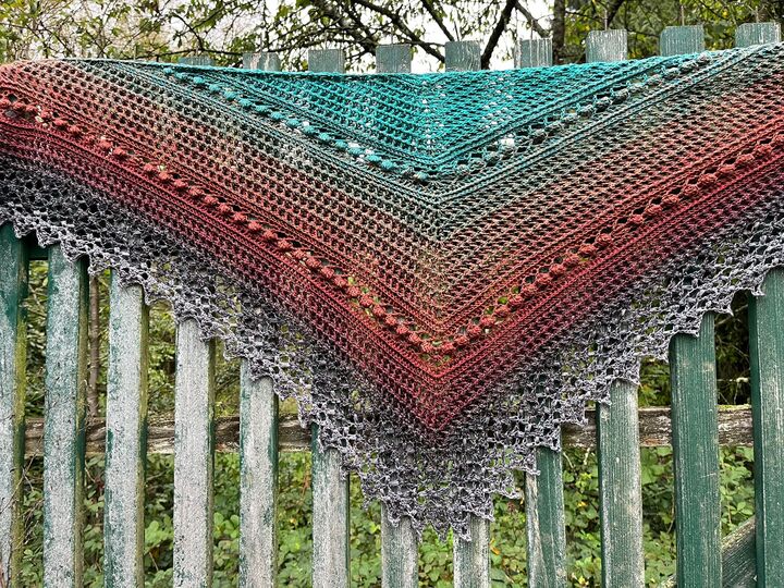 Das einfache Strukturmuster sorgt für kuschelige Wärme, während die großen Noppen spielerisch Akzente setzen. Ein besonderer Blickfang ist die dekorative Bordüre, die dem Tuch seinen einzigartigen Charakter verleiht. Für alle, die es noch exklusiver mögen: Die Bordüre kann auch mit Perlen verziert werden (dies ist allerdings nicht gesondert in der Anleitung erklärt, sondern nur als Hinweis für erfahrene Häkler:innen gedacht).