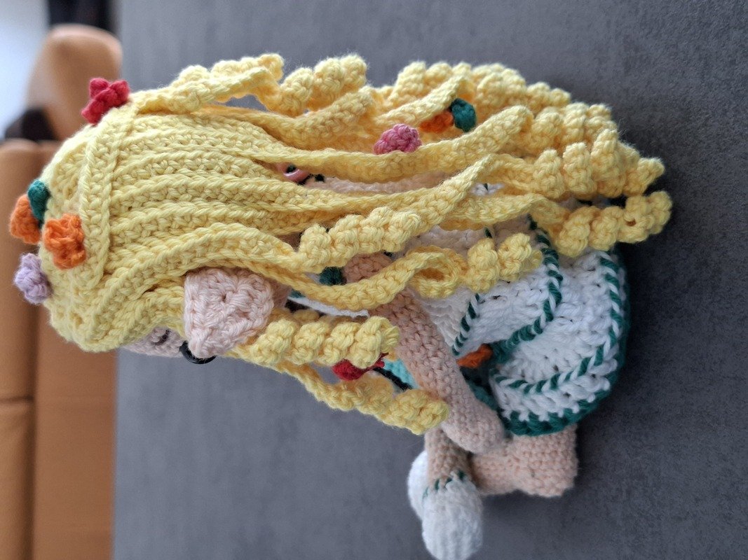 Sicherheit geht vor: Die Augen der gehäkelten Elfe sind sicher und fest von innen verankert, sodass es keine Gefahr gibt, dass sie herausgerissen oder verschluckt werden.