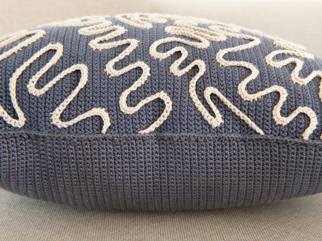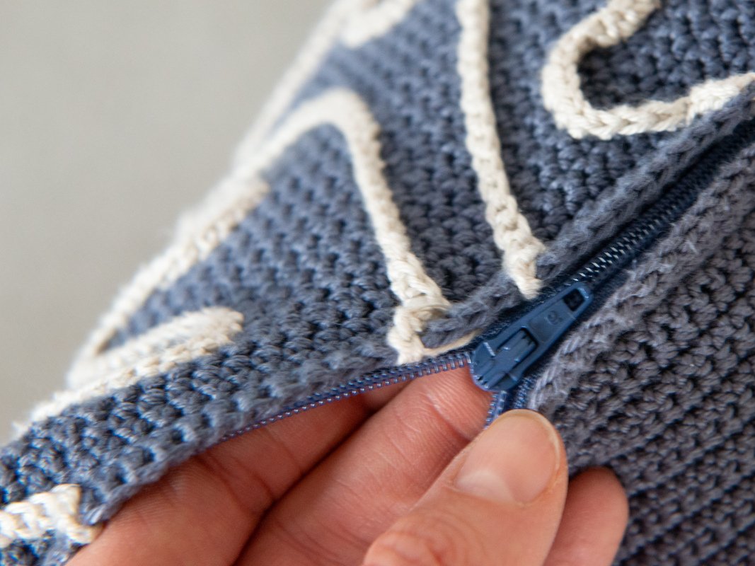 First, crochet the front of the cushion and then the back. The pattern is then embroidered onto the front and crocheted over. Now, sew in the zipper. Finally, crochet the front and back together.