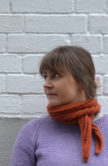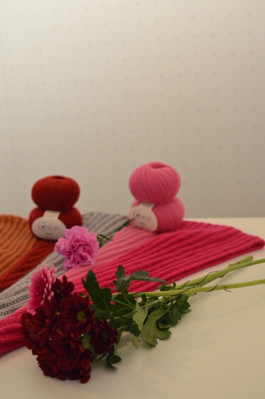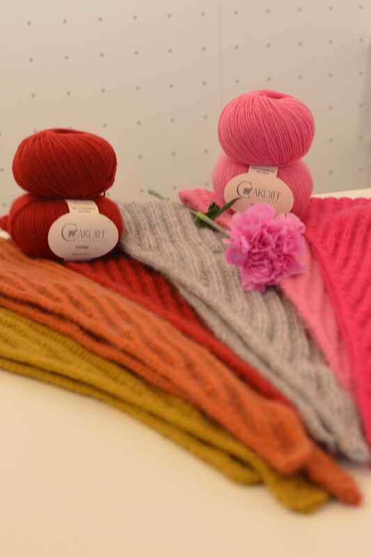 Sample 2 (orange): Cardiff Cashmere, Classic (DK; 100% cashmere, 112 m (122 yds) per 25 g) in shade 675 held together with Cardiff Cashmere, Prime (lace; 300 m (328 yds) per 25 g) in shade 675