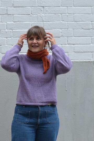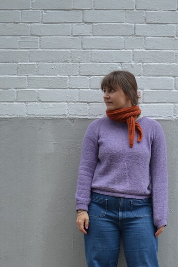 The ENNA shawl basic can be worn wound around the neck twice and tied with a knot. You can adjust the size to your liking and make the shawl in any size, yarn weight, gauge and matching needle size.