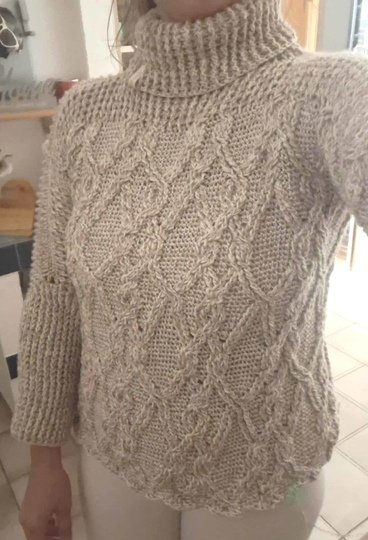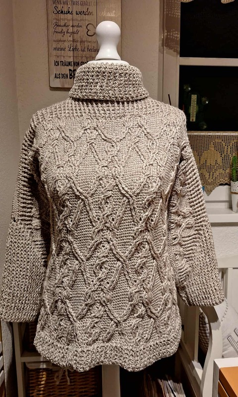 Die Schritt-für-Schritt-Anleitung beinhaltet komplett schriftlich ausformulierte Runden, Häkelschriften für den gesamten Pulli, Bilder und erklärende Fotostrecken für die Verzopfungen.