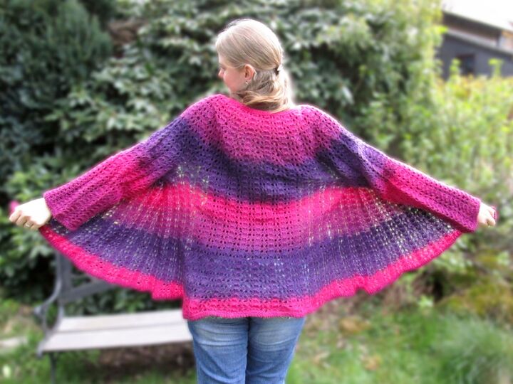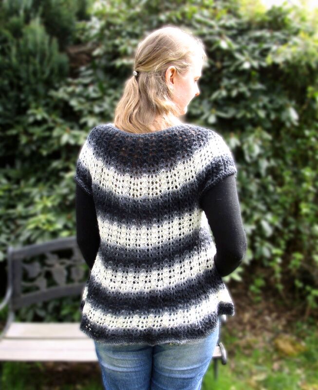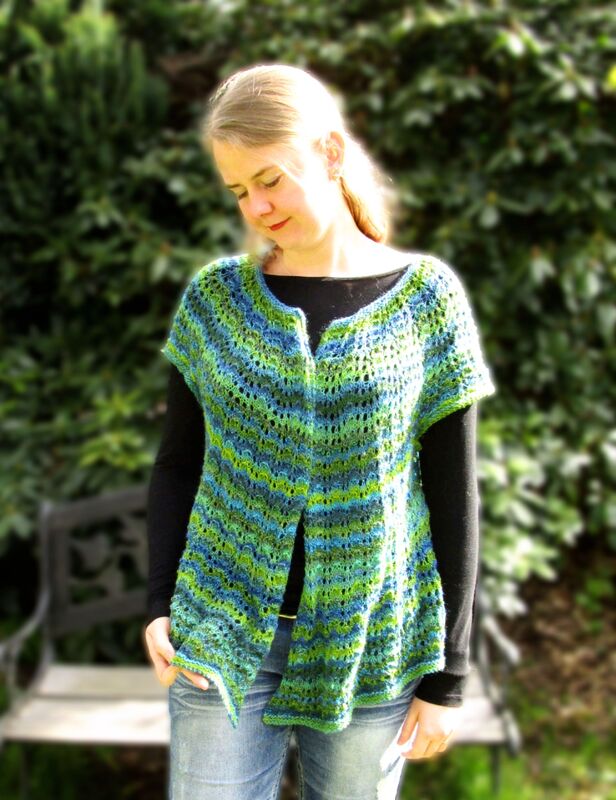 The lace pattern is much easier to knit than it seems. You only have to knit “holes” on every fourth row. The other three rows are just stockinette. That makes this vest or cardigan a fast and relaxing knit, not one that requires your full attention from start to finish.
