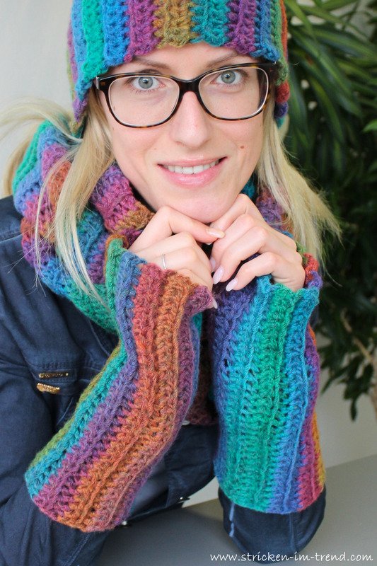The BONUS crochet set (hat, scarf & mitts) is worked in one size (fits most).