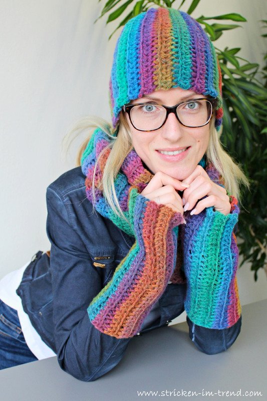 a delicate scarf, a matching hat and mitts – all perfectly coordinated with the style and yarn of the poncho.