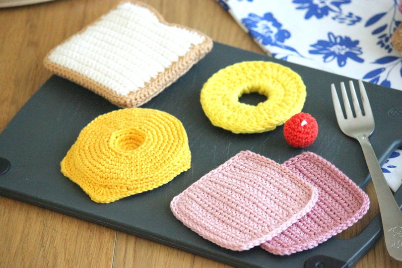 Die einzelnen Teile dieses interaktiven Menüs sind schnell und einfach nachgehäkelt und bringen eine Menge Spass! Eine tolle Ergänzung für die Spielküche der Kids - und ausserdem eine praktische Möglichkeit um Baumwollreste zu verarbeiten :-)