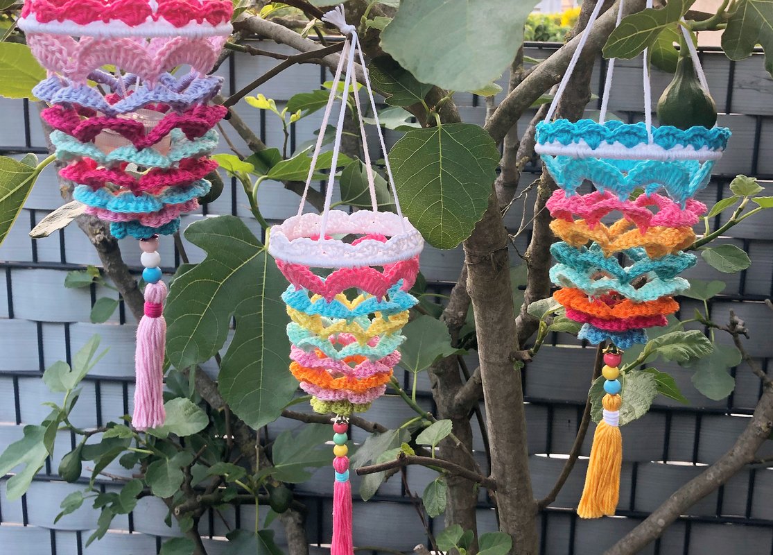 This PDF pattern explains step by step how to make these little crocheted lanterns in a motley boho style with boho-typical tassels.