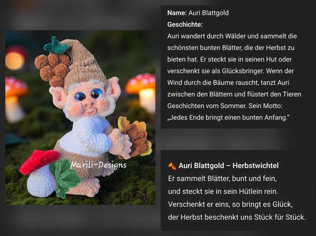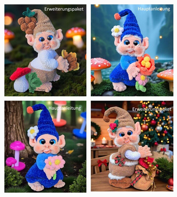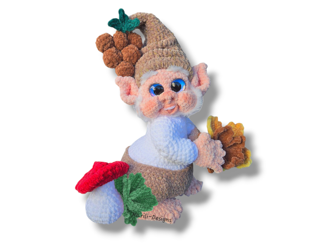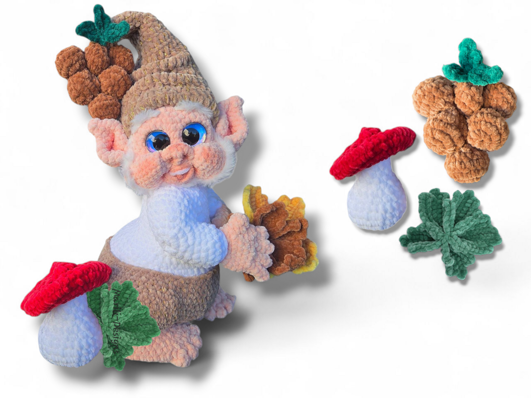 This package only contains the instructions for the autumnal accessories (mushrooms, grapes, and leaves). The basic gnome is crocheted using the instructions from the “Seasonal Gnomes” starter pack and is not included in the delivery. You can find it here: https://www.crazypatterns.net/en/store/Marili-Designs