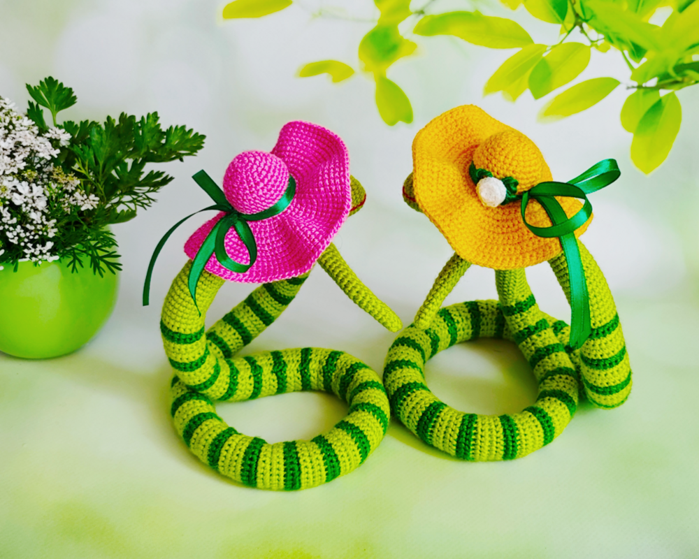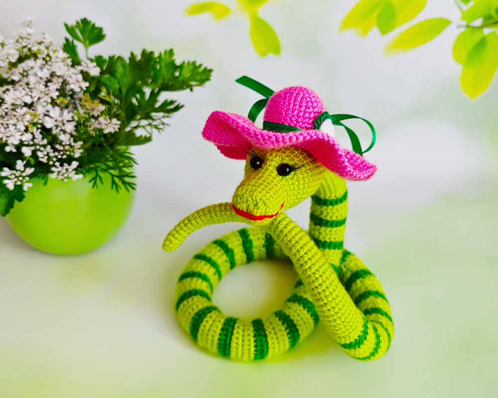 YARN: 8 g of pink, 10 g of green, 30 g of light green, small amount of red and white. I used 300m/100g for the body and 400m/100g for the accessories.