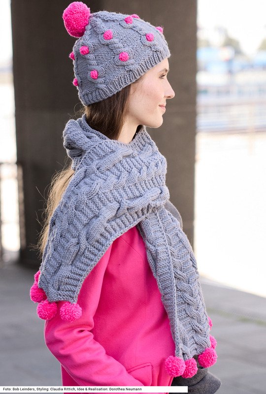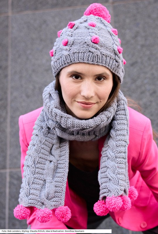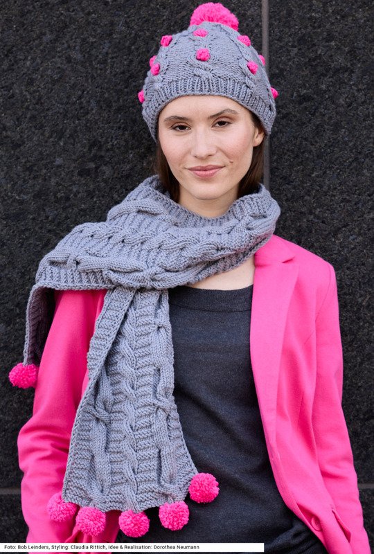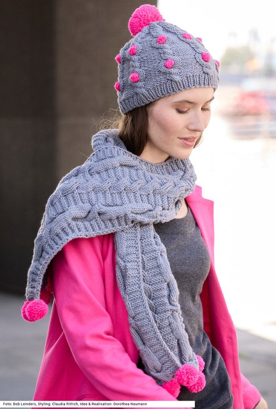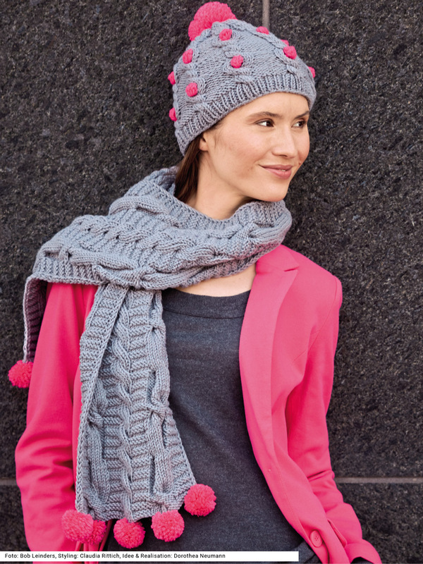 Dieses modische Power-Duo aus kuschelweichem Garn gibt jedem Outfit die besondere Note. Schal und Mütze in dunklerer Farbe sind mit einem prägnanten, detailreichen Zopfmuster verziert, das durch plastische Querrippen voneinander getrennt wird. Knallige Farbakzente in Form von Pompon und Noppen an der Mütze und einigen Bommeln am Schal strahlen Lebensfreude und Selbstbewusstsein aus. Eine Anleitung kann für den Schal mit 21 x 160 cm und die Mütze für 53 – 55 und 57 – 59 cm Kopfumfang downgeloadet werden.