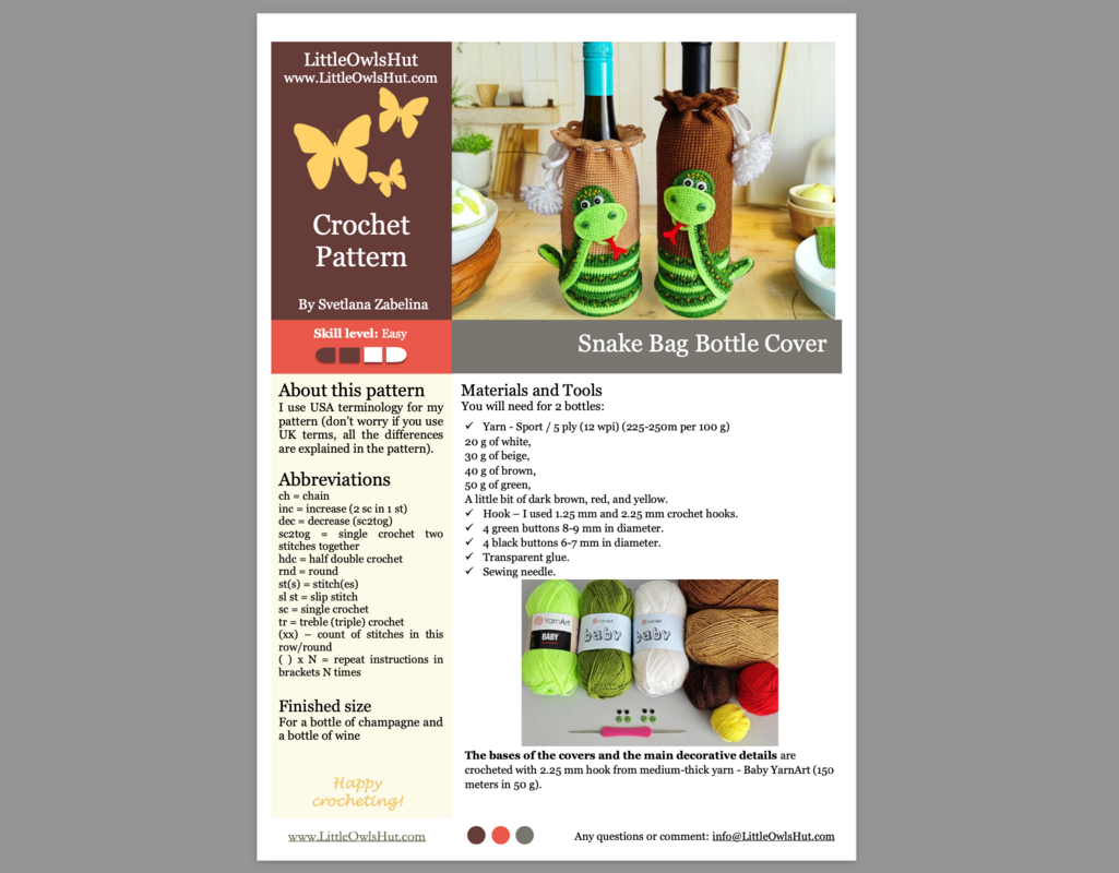 Get creative this holiday season with our 351 Bag Crochet Pattern Snake, perfect for crafting charming bottle covers for water, wine, and champagne! This delightful crochet tutorial, designed by Zabelina, gives you a straightforward and enjoyable way to gift your loved ones something truly unique for Christmas and New Year celebrations. Imagine the joy on their faces as they unwrap a beautifully adorned bottle, reflecting your thoughtfulness and skill. Embrace the warmth of handmade gifts and elevate your festive gatherings—grab your crochet hook and start this enchanting project today!