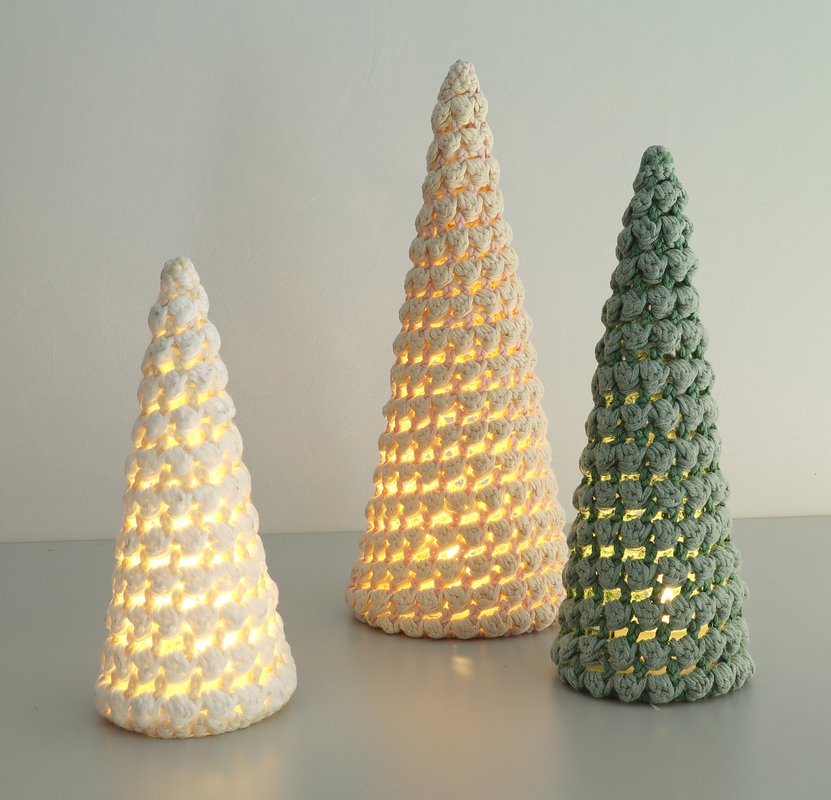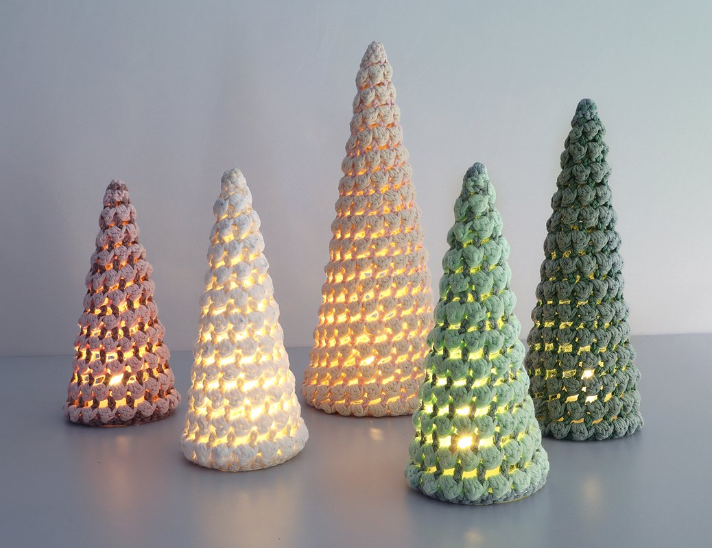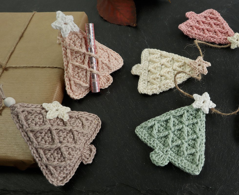 These charming little trees can be used in many ways – as a festive garland, tree ornaments, or cute keychains. For the garland, the trees are worked single-layered and edged with slip stitches.