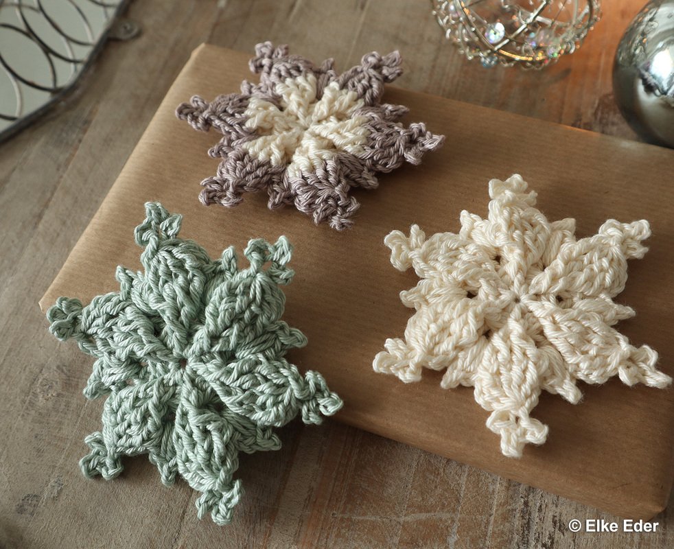 Crocheted in just 4 rounds, it’s a quick and magical winter project. Whether made in one or two colours, these icy crystals will sparkle on your Christmas tree or as festive accents on gifts and tables.