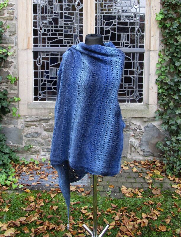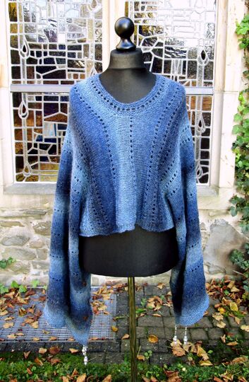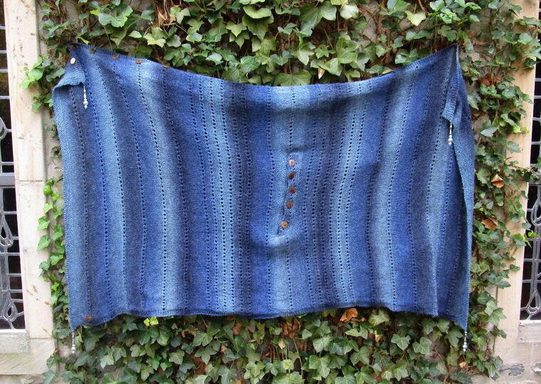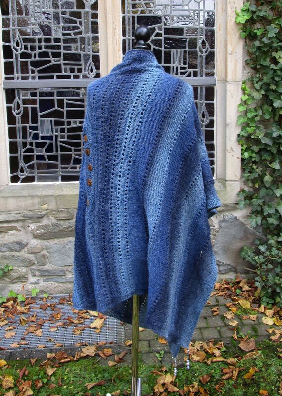 Turning it 90 degrees, you create a shrug. Or can this be regarded as a bolero? Or a loose fit sweater? Here, you can also button up as far down as you like. And when you want to wear a huge stole, you button up the neckline. And wear it across. Whereupon you can button up this stole in front.