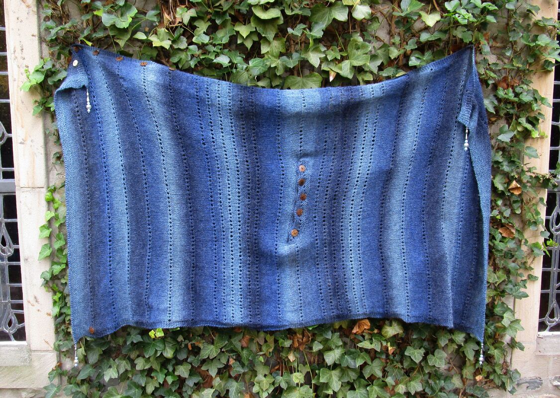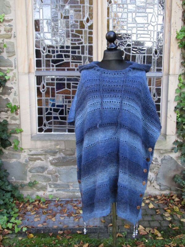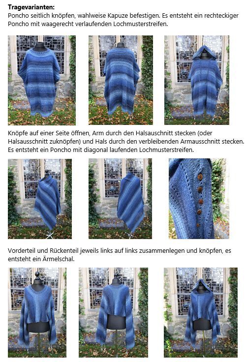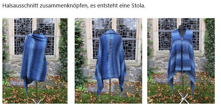 Furthermore, you can twist the poncho. With a 45 degrees twist, the eyelets are diagonal, and you button up the neckline.
