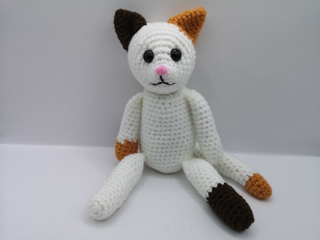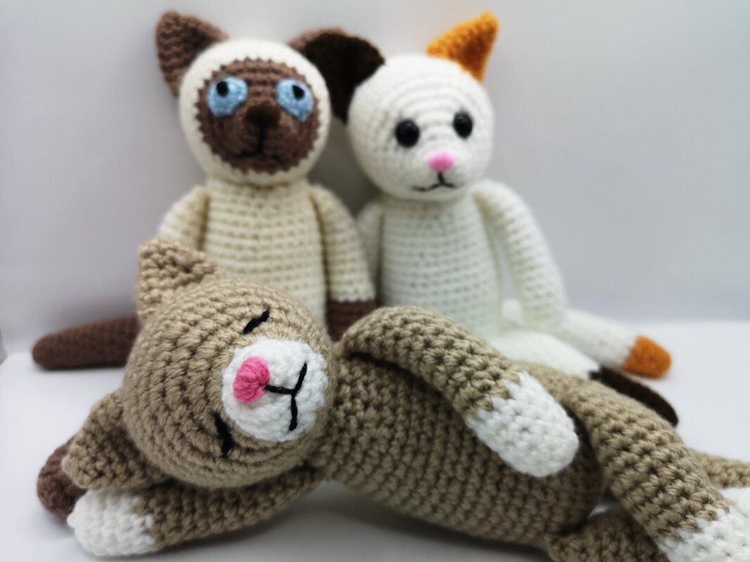 With this crochet pattern, you can easily crochet cats in 3 different variations – with minimal sewing. The instructions provide detailed explanations with pictures on how to crochet a solid-colored cat, a Siamese cat, and a calico cat. The size is perfect as a cuddly toy. Using thicker yarn like chenille makes it even larger and extra cozy.