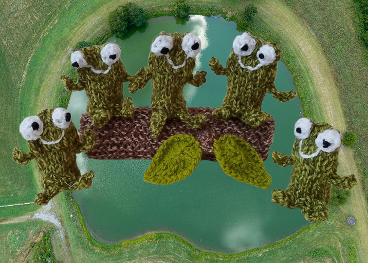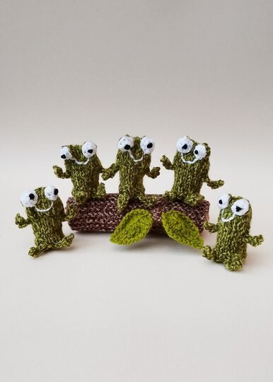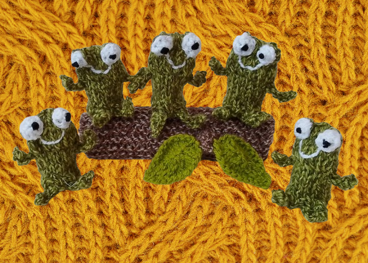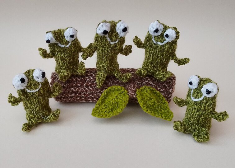 Turn your knitting into a performance with this playful puppet set inspired by Five Little Speckled Frogs.